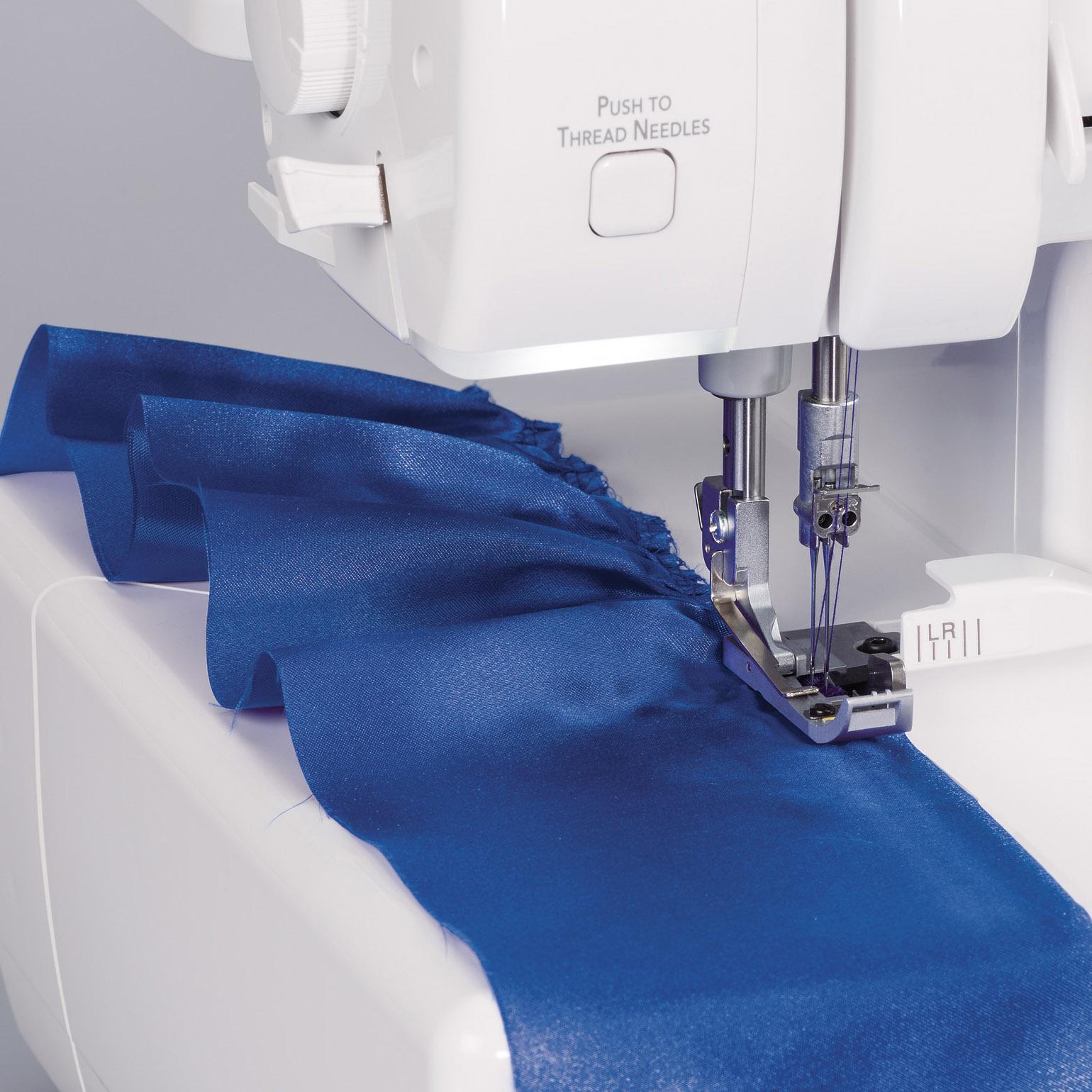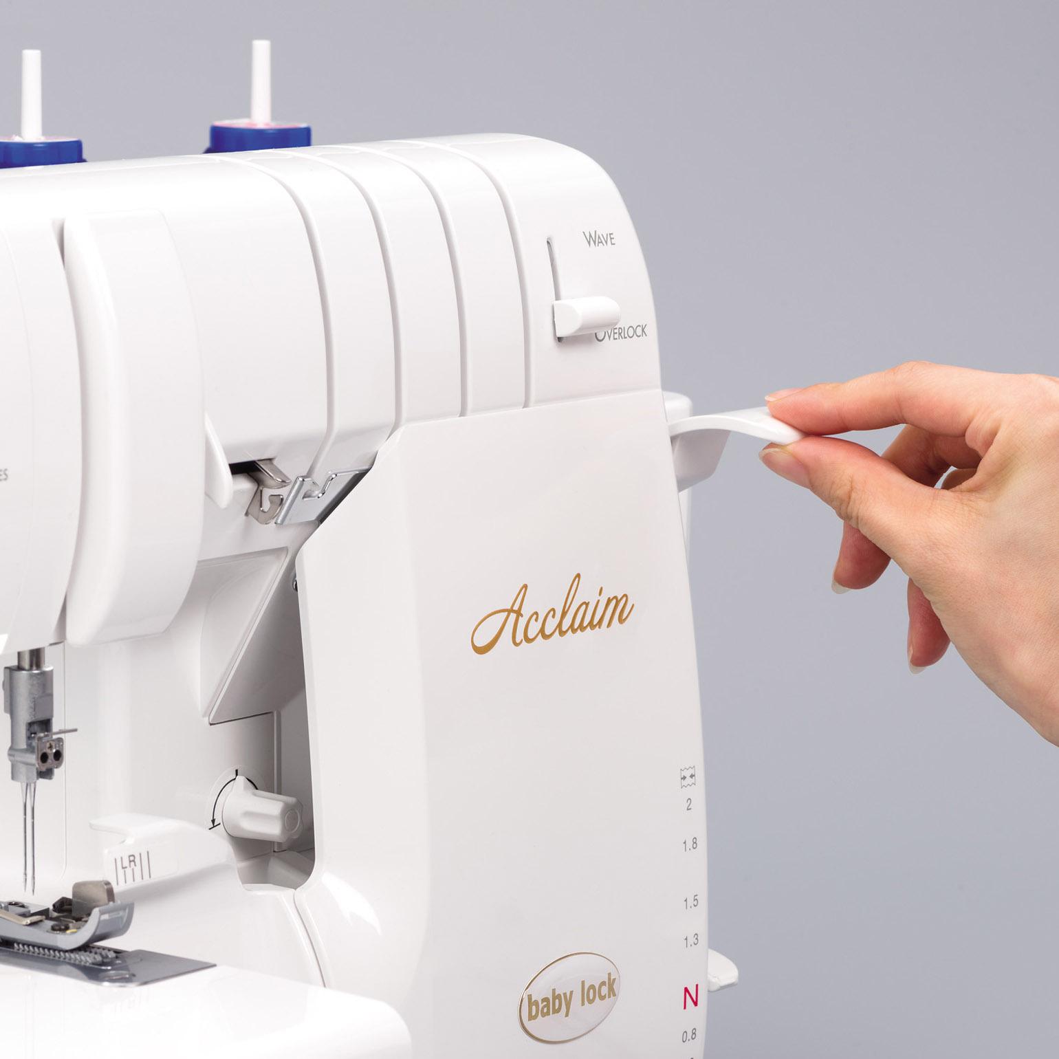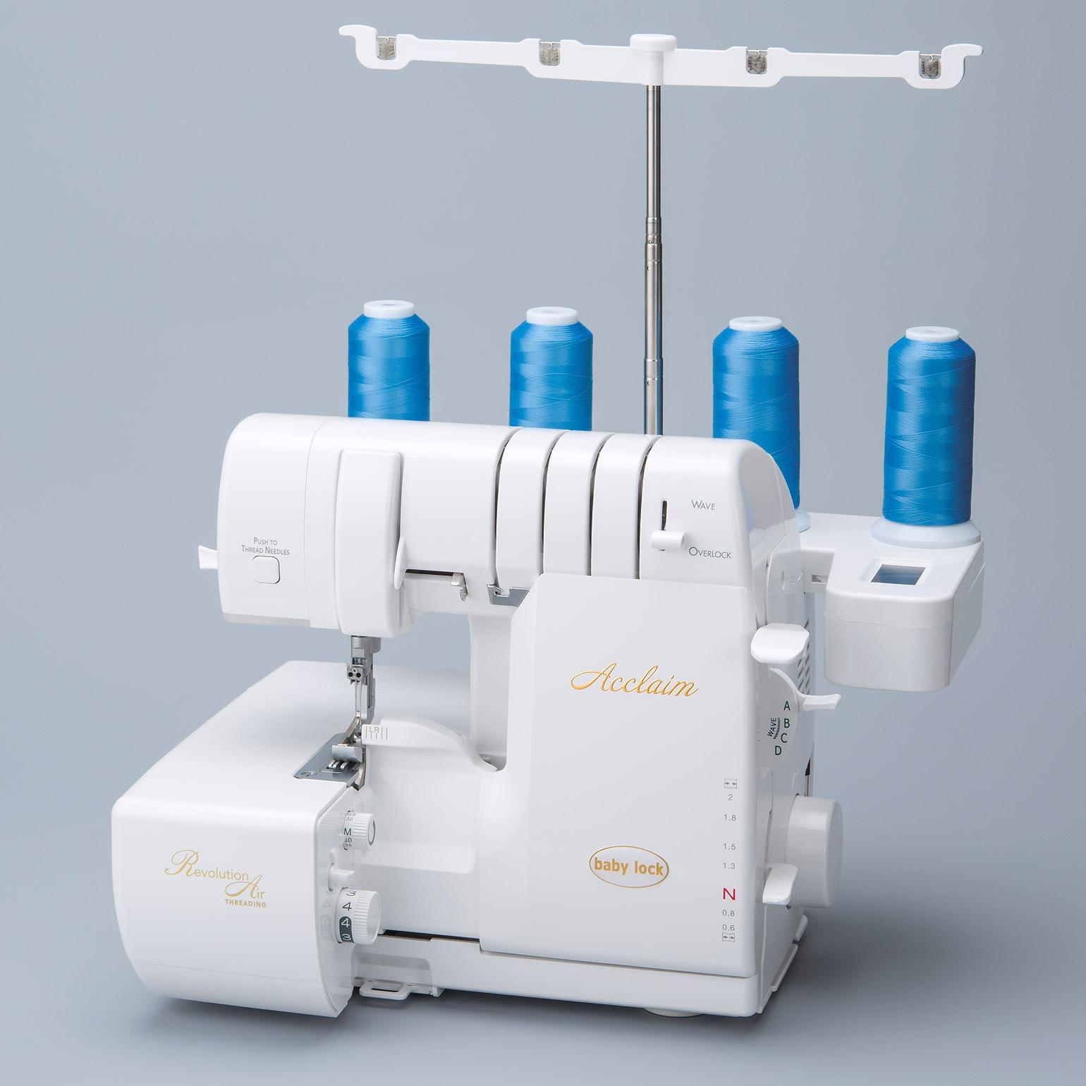 The Acclaim is Baby Lock’s top-end 4-thread overlocker, featuring RevolutionAir™ Threading that threads the loopers with just the touch of one button, and threads the needles with the touch of another.