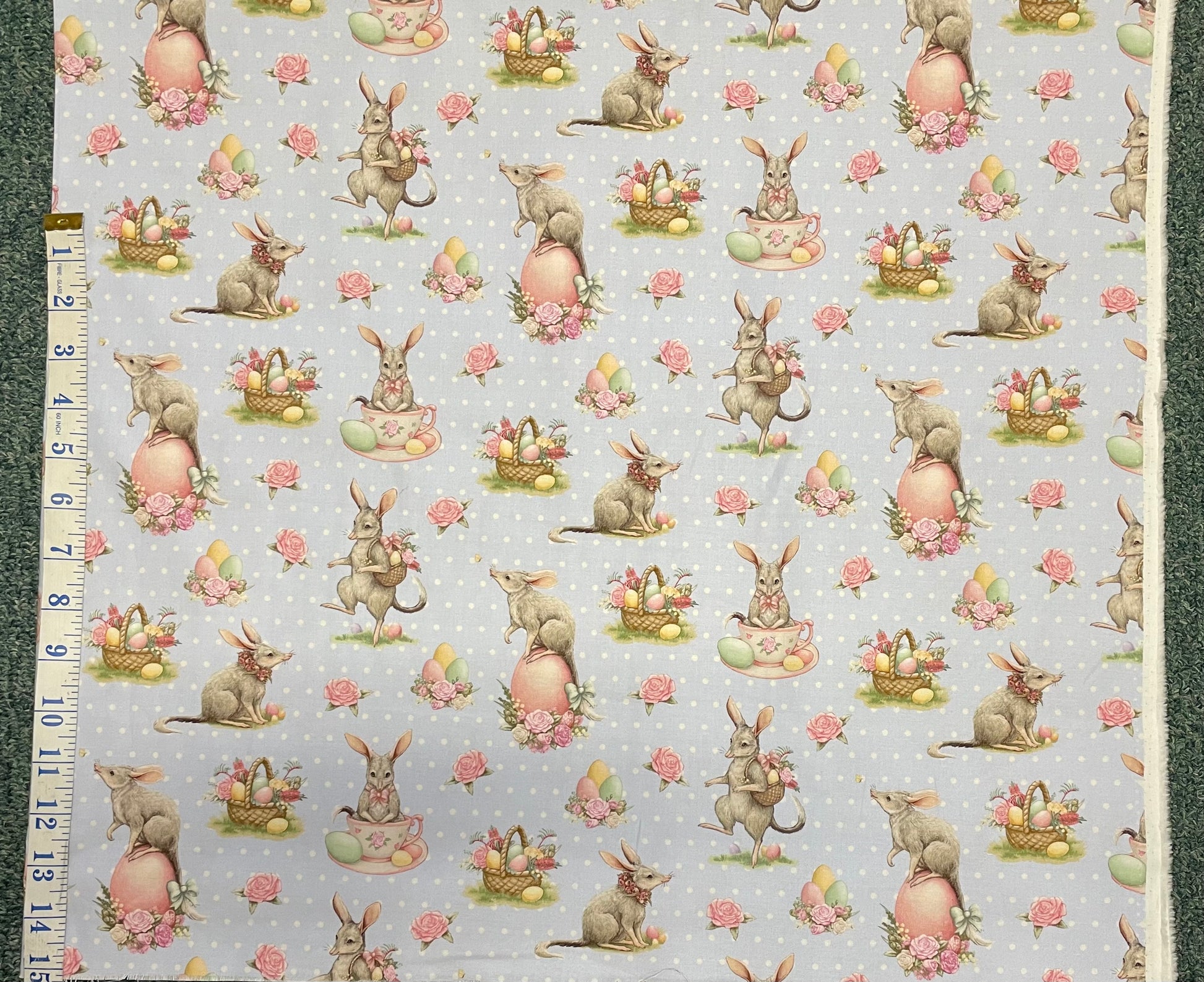 Bilby, easter eggs, teacups,flowers and baskets. on pale blue and off-white spot background.