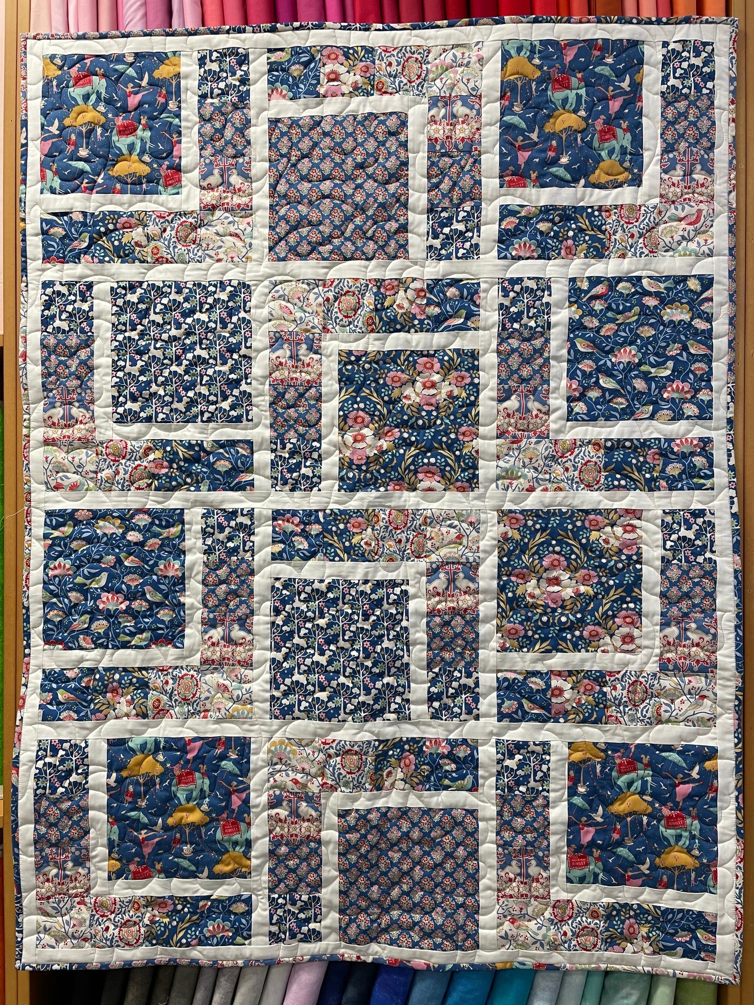 This lap quilt was made using the Tilda Jubilee fabrics in blue as pictured.